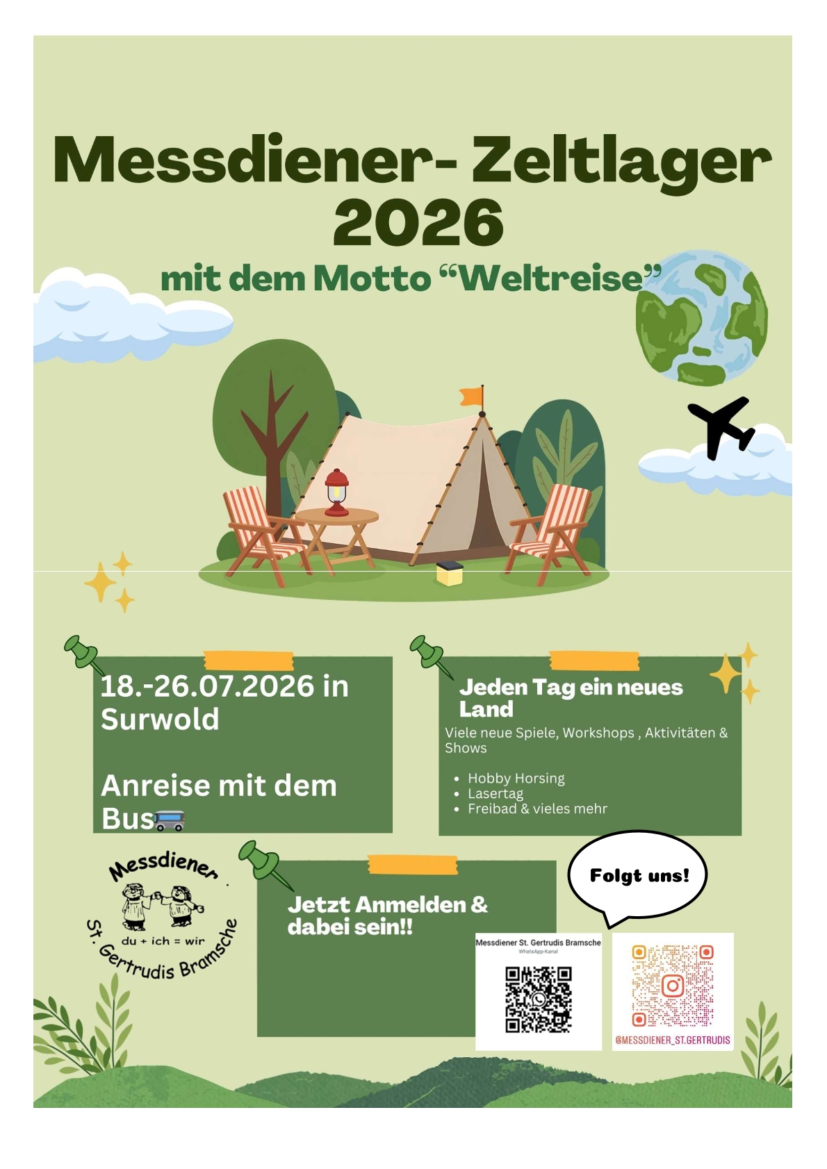 Die Anmeldungen für das Messdienerzeltlager St. Gertrudis Bramsche sind raus! Hier geht’s zu dem Anmeldungen! (In der Anmeldung hat sich auf Seite 3 ein Fehler eingeschlichen: Wir fahren natürlich am SAMSTAG, den 18.07. los 😉 ) Dieses Jahr geht es nach Surwold! Und da wir durch die Umfragen erfahren haben, dass viele Messdiener*innen nicht so […]