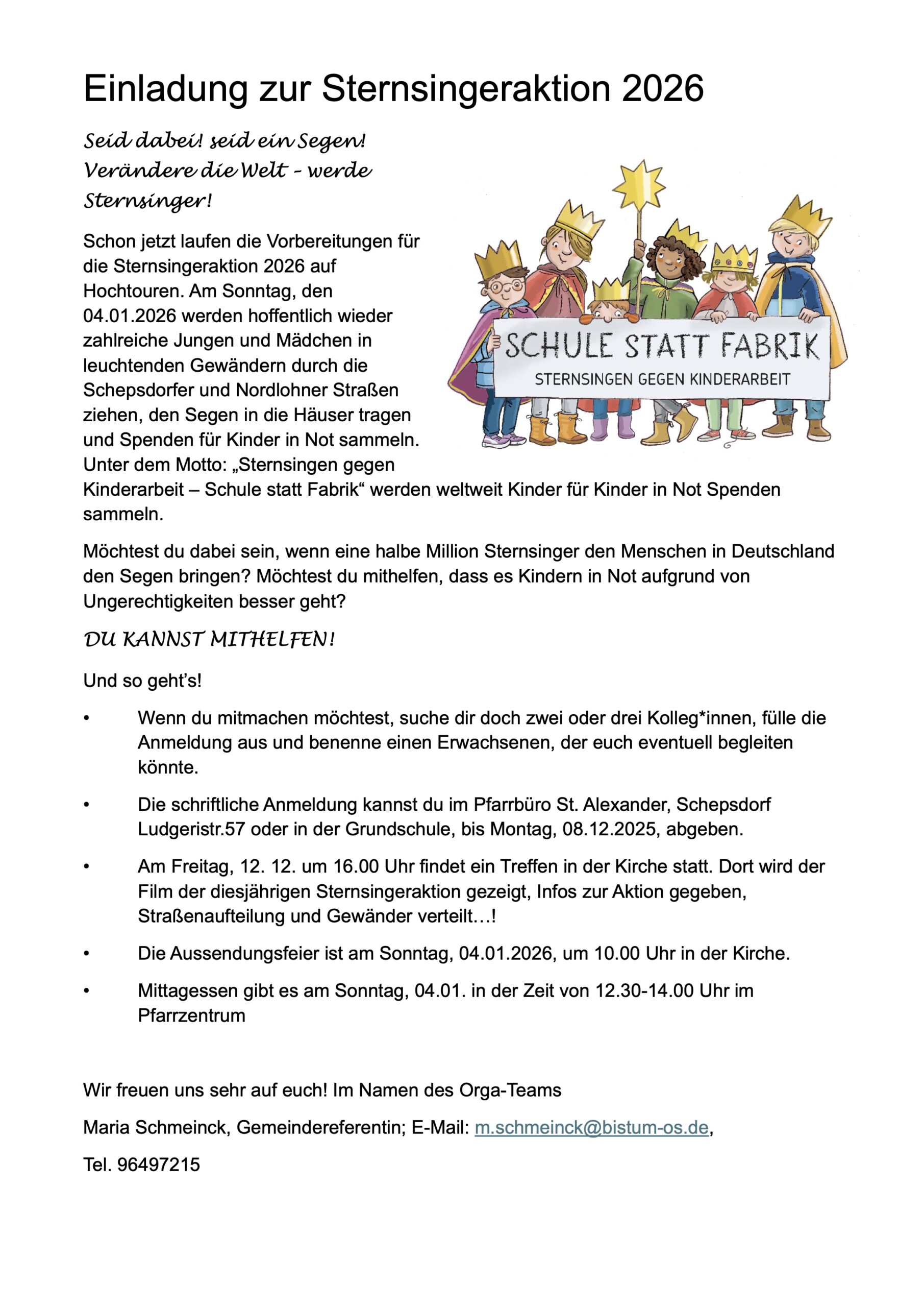 Seid dabei! seid ein Segen! Verändere die Welt – werde Sternsinger! Schon jetzt laufen die Vorbereitungen für die Sternsingeraktion 2026 auf Hochtouren. Am Sonntag, den 04.01.2026 werden hoffentlich wieder zahlreiche Jungen und Mädchen in leuchtenden Gewändern durch die Schepsdorfer und Nordlohner Straßen ziehen, den Segen in die Häuser tragen und Spenden für Kinder in Not […]