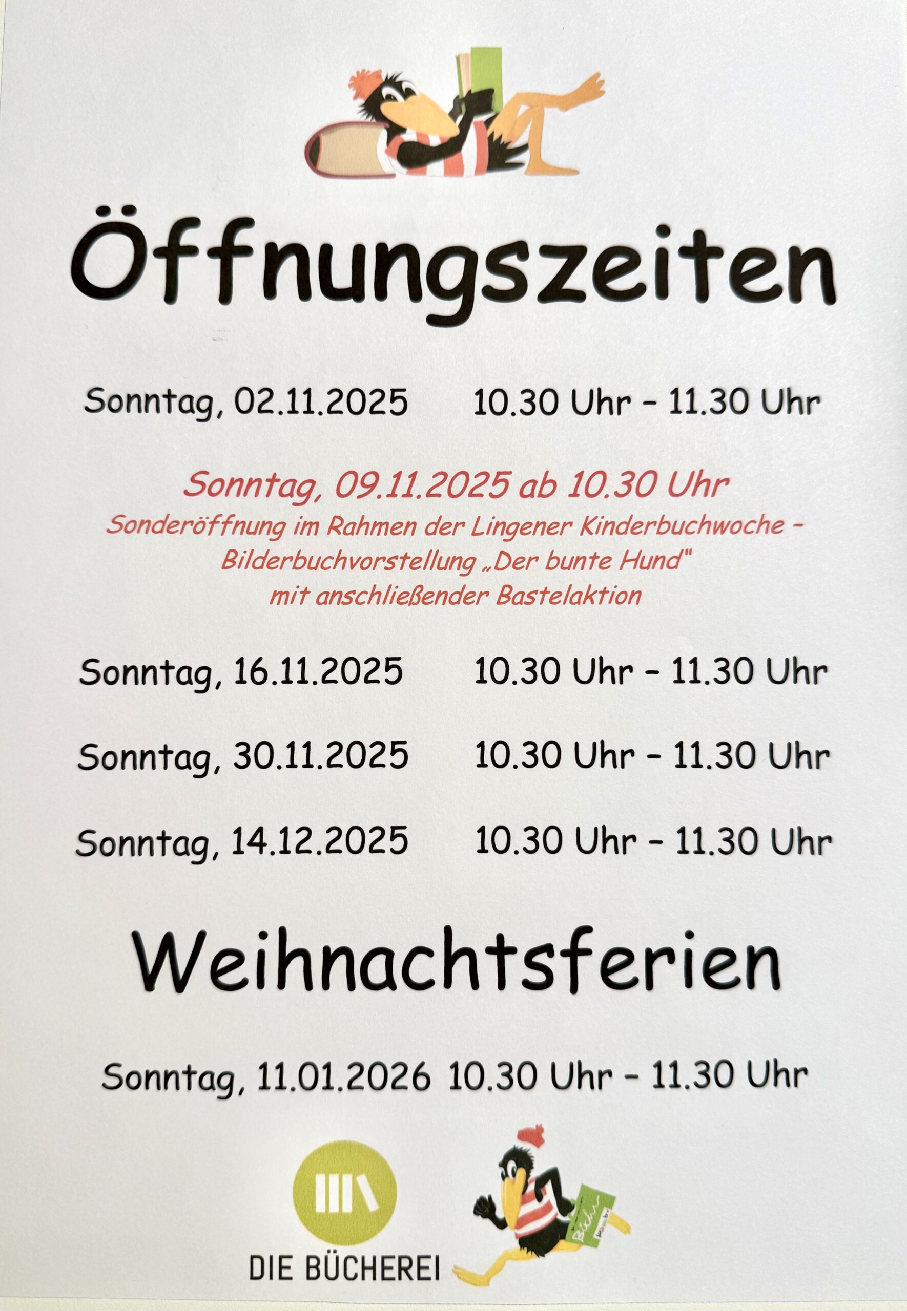 Die Bücherei Schepsdorf beteiligt sich an der 14. Lingener Kinderbuchwoche mit einer Bilderbuchvorstellung und anschließender Bastelaktion unter dem Motto: „Ein bunter Hund“ Am Sonntag, den 09.11.2025 ab 10:30 Uhr wird in der Bücherei Schepsdorf das Buch „Ein bunter Hund“ von Rob Biddulph und Steffen Jacobs vorgestellt. Kurzer Inhalt des Buches: Als bunter Hund hat man’s […]