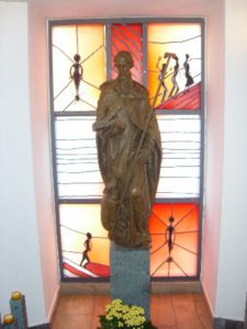 In dem ansonsten zurückhaltend ausgestatteten neuen Kirchenraum haben zwei wertvolle alte Figuren einen Platz in den Seitennischen gefunden: