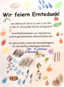 zum Erntedankfest mit dem Schepsdorfer Kinderchor am Mittwoch, 08.10.2025, um 17:00 Uhr, mit anschließendem Abend-Imbiss. Bitte für das Buffet eine Kleinigkeit mitbringen.