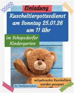 Am Sonntag, 25.01.2026 fand in der Kita in Schepsdorf unser Kindergottesdienst „Gottesdienst mit den Kleinsten“ statt. Wir haben gemeinsam den Sonntag gefeiert – mit fröhlichen Liedern, einer altersgerechten Geschichte und viel Raum für Lachen, Staunen und Mitmachen. Auch die Kleinsten waren willkommen, so wie sie sind. Vielen Dank an alle Familien, Kinder und Begleitpersonen – es war ein lebendiger Gottesdienst, bei dem sich Groß und Klein wohlgefühlt haben.