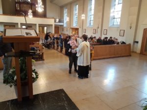 Eingeladen waren die Täuflinge des letzten Jahres aus den Gemeinden St. Gertrudis (Bramsche) und Christ König (Darme) mit ihren Familien. In dieser Feier wurde den Täuflingen und deren Eltern noch einmal der Segen Gottes zugesprochen. Es ist schön, dass diese Feier einen festen Platz in der Jahresliturgie unserer Gemeinden gefunden hat. Im Anschluss an die Segnungsfeier in der Kirche waren alle eingeladen mit ins Pfarrheim zu kommen, um dort, bei Kaffee und einem Stück Kuchen, noch ein wenig Zeit miteinander zu verbringen.